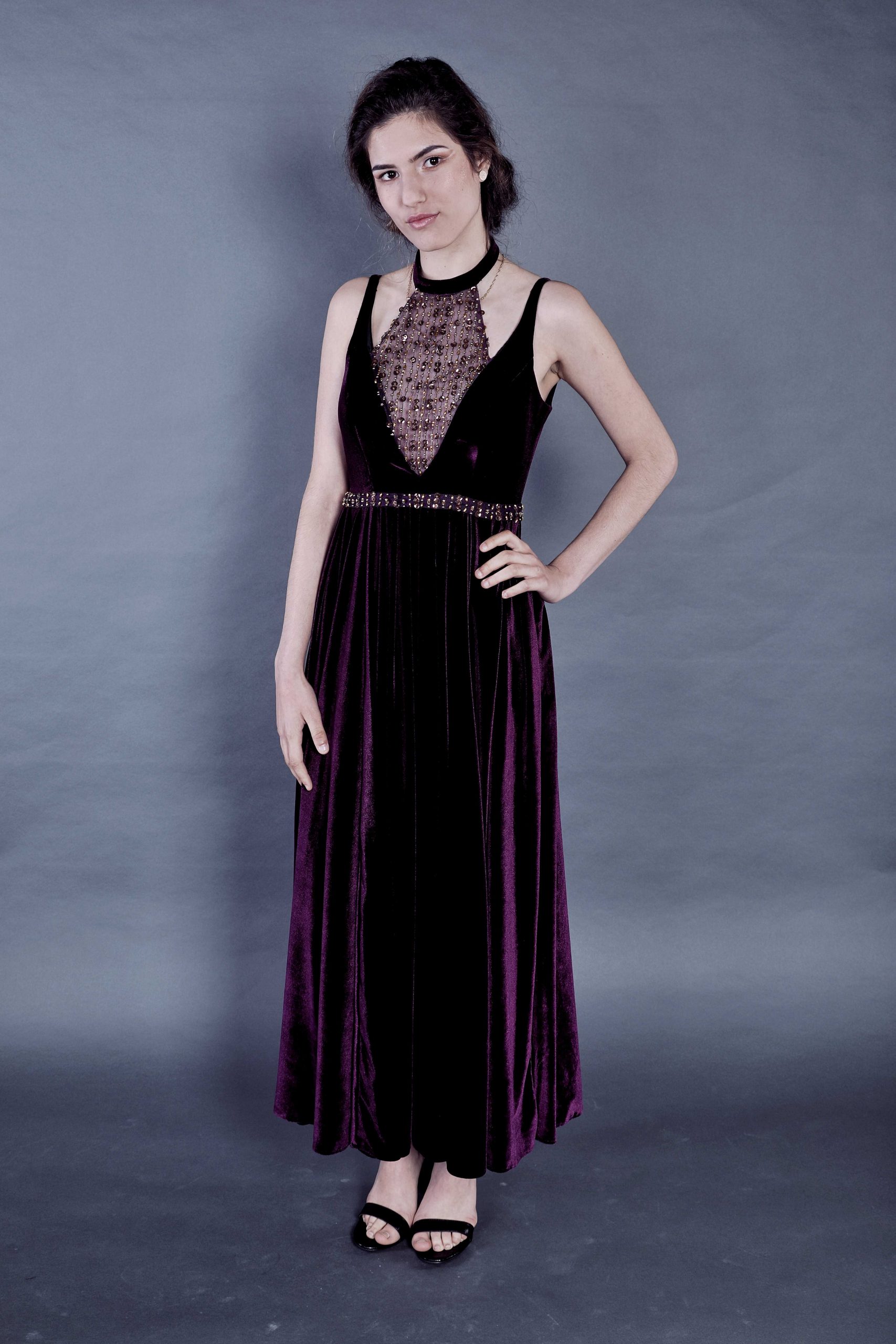 Derékbab húzott elől, hátul mélyen kivágott hosszú bársony ruha. Elől a dekoltázs tüllös betéttel van