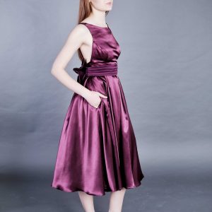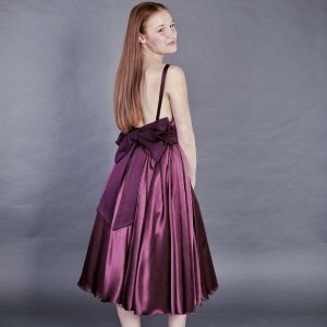 Fényes organza belebújos ruha, pufi ujjakkal, kerek nyakkivágással. Derékban szabott, hajtásos szoknya, derekán két oldalt pántokkal, amivel szorosabbra lehet kötni hátul.